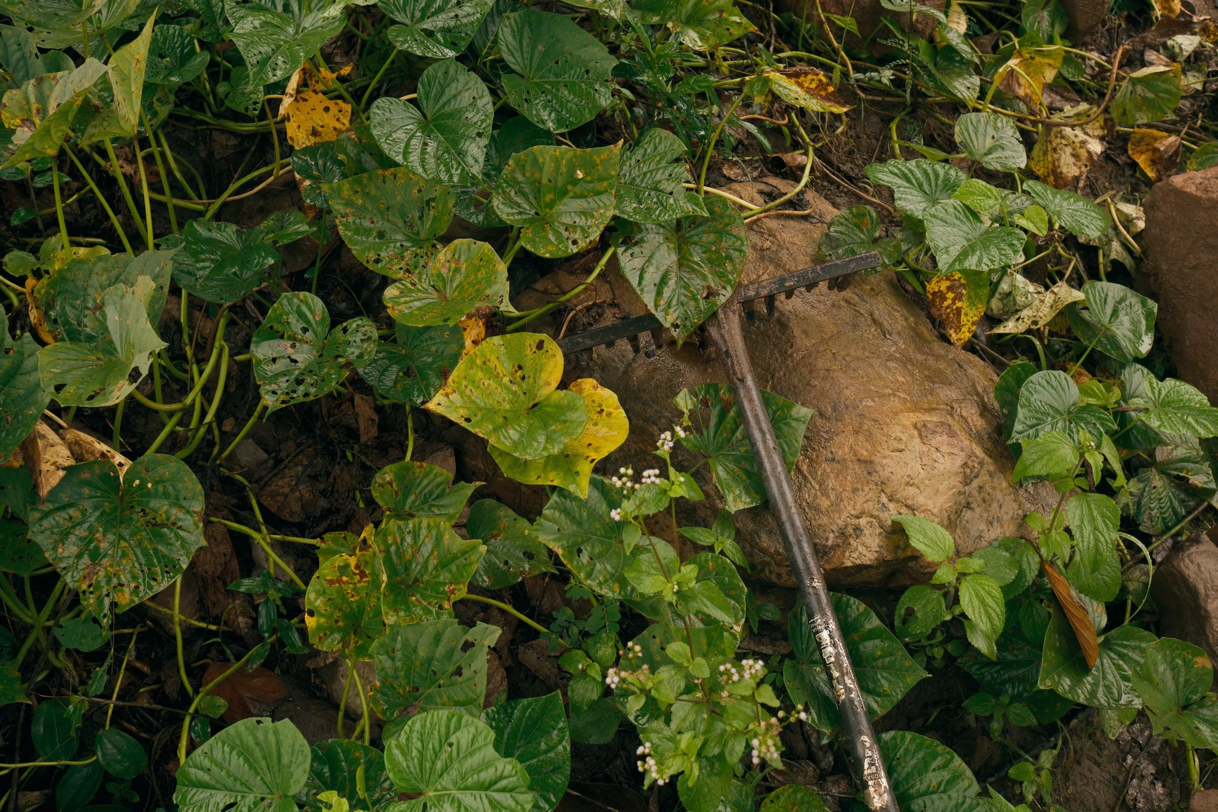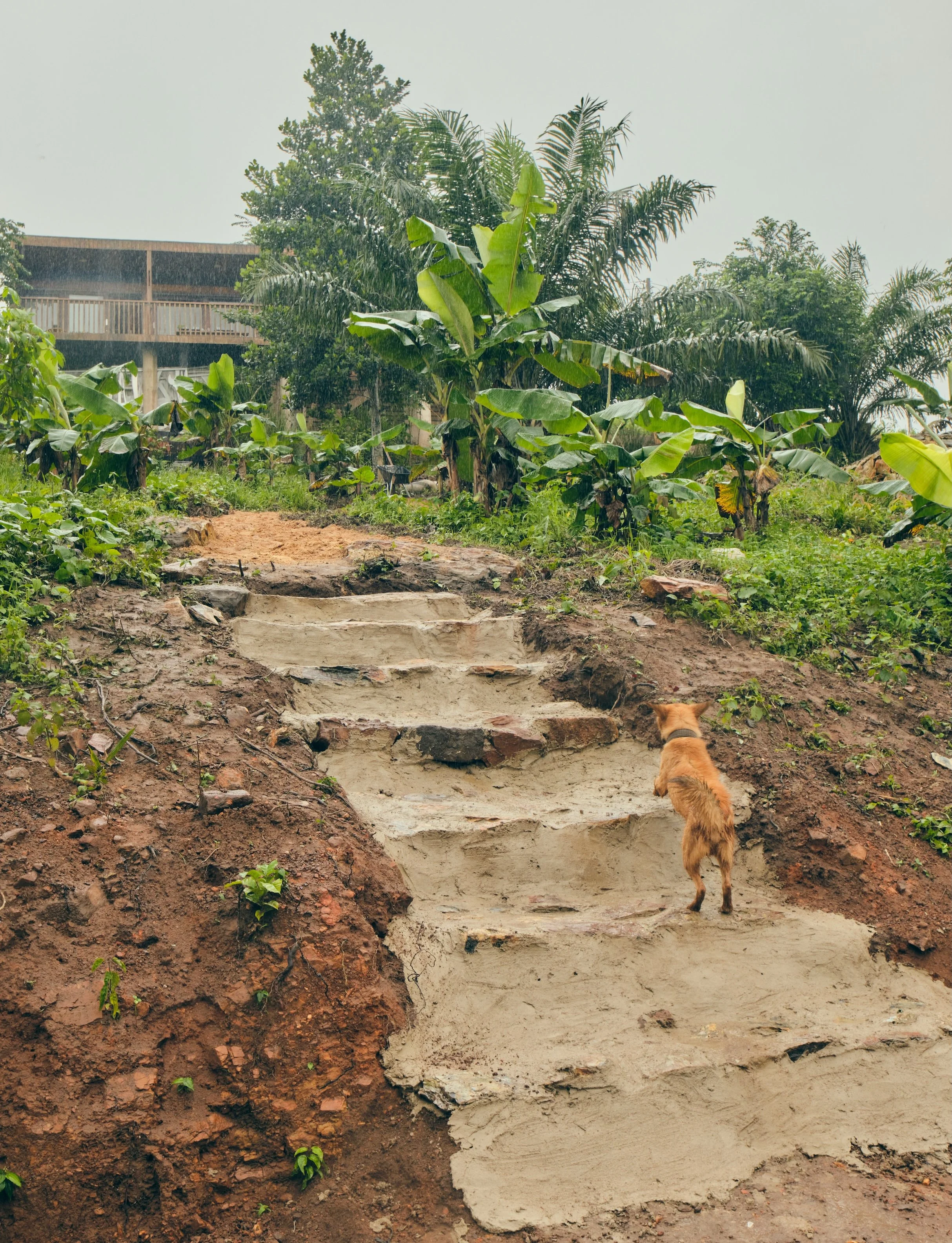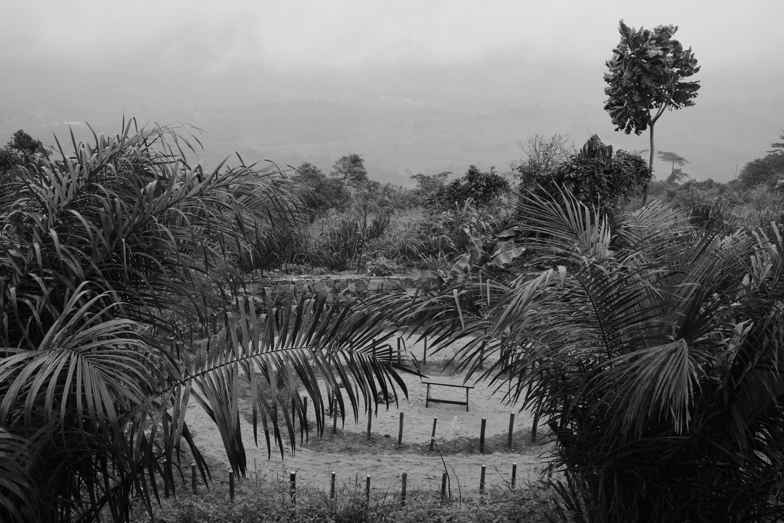 The land we come to is in the midst of Konkonuru, a town within Ghana’s Aburi Mountains. It is the rainy season and fog touches everything almost always, but especially in the wake of downpours. On days when it clears, I see the entirety of a steep half acre dotted with patches of oil palm, pawpaw and plantain trees. The land is rocky and, walking down the slope, we make a path navigating the large stones, grasses that reach our knees, and dozens of plants whose names I don’t yet know.