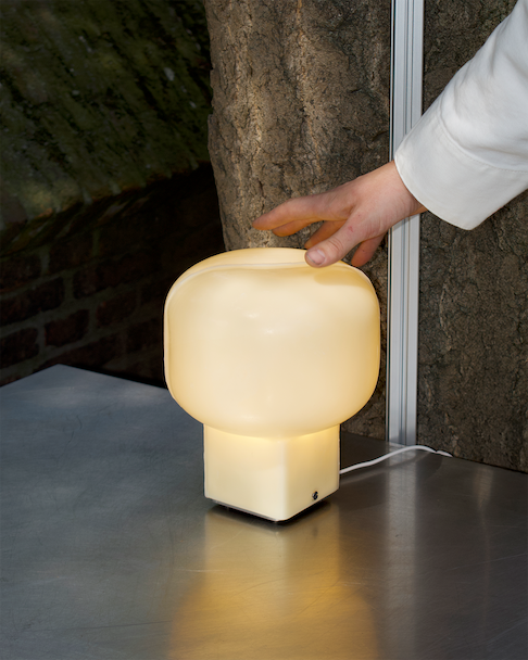 Each of the studio’s three lamp designs – a mushroom-shaped table lamp, a rectangular wall lamp and a circular hanging lamp – all use the same weight of wax. “We wanted to illustrate the concept of owning material rather than owning an object,” Gaud says, explaining that each lamp can be returned to the studio and melted down into a different shape. “Maybe you move from one place to another and you don’t have a spot for a wall light anymore, so you reshape it into a table lamp,” he continues. “Having something that follows you around for years is what interests us.” All of the lamps use the same base and electronics, which were created by OpenStructures, a design studio based in Brussels who have developed a grid of standardised components. “The electronics can go back into the open structure system and become new objects,” Gaud says, explaining that the studio wanted to make every part of the lamp recyclable so that customers have the option of transforming it into different products as the studio expands their catalogue. “A lot of people think wax is fragile, but actually, if you design the right shape and proportions, it can be really strong,” Gaud says. “I think designing a stool would be a great way to show that.”