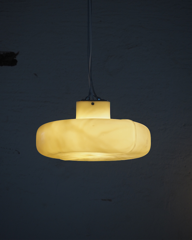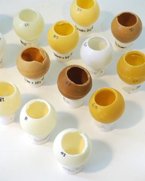 It is perhaps unsurprising that the wax lamps were able to take on some of the features of plastic, given that the project began when Gaud and Lohner decided to investigate rotational moulding, a process typically employed in plastic production. “We wanted to use an alternative to plastic, and the idea was to find a material that would withstand heat and be easily mouldable,” Gaud says, explaining how they created a rotational moulding machine using YouTube tutorials, and began experimenting with different wax recipes. The studio aimed to find a recipe that would withstand up to 80° of heat without melting, and after creating around 50 different material tests, ranging in colour from burnt biscuit to golden egg yolk and creamy white, the team landed on their buttery mixture of beeswax and plant-based wax. “There aren’t any other long-lasting objects made out of wax; it’s only used for temporary objects,” Gaud says. “So troubleshooting production problems was tough, because there was no history to learn from. You kind of just have to improvise.”