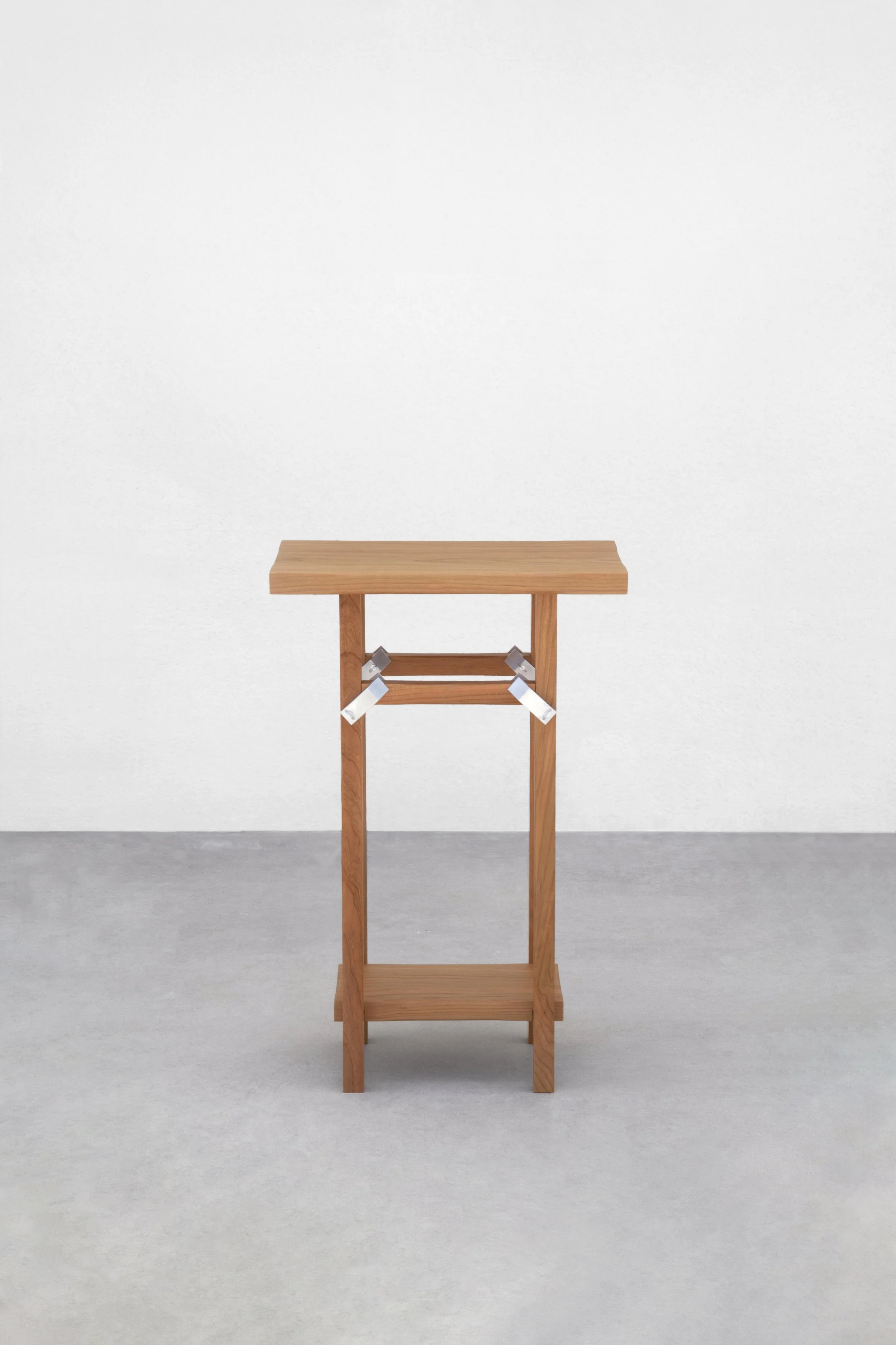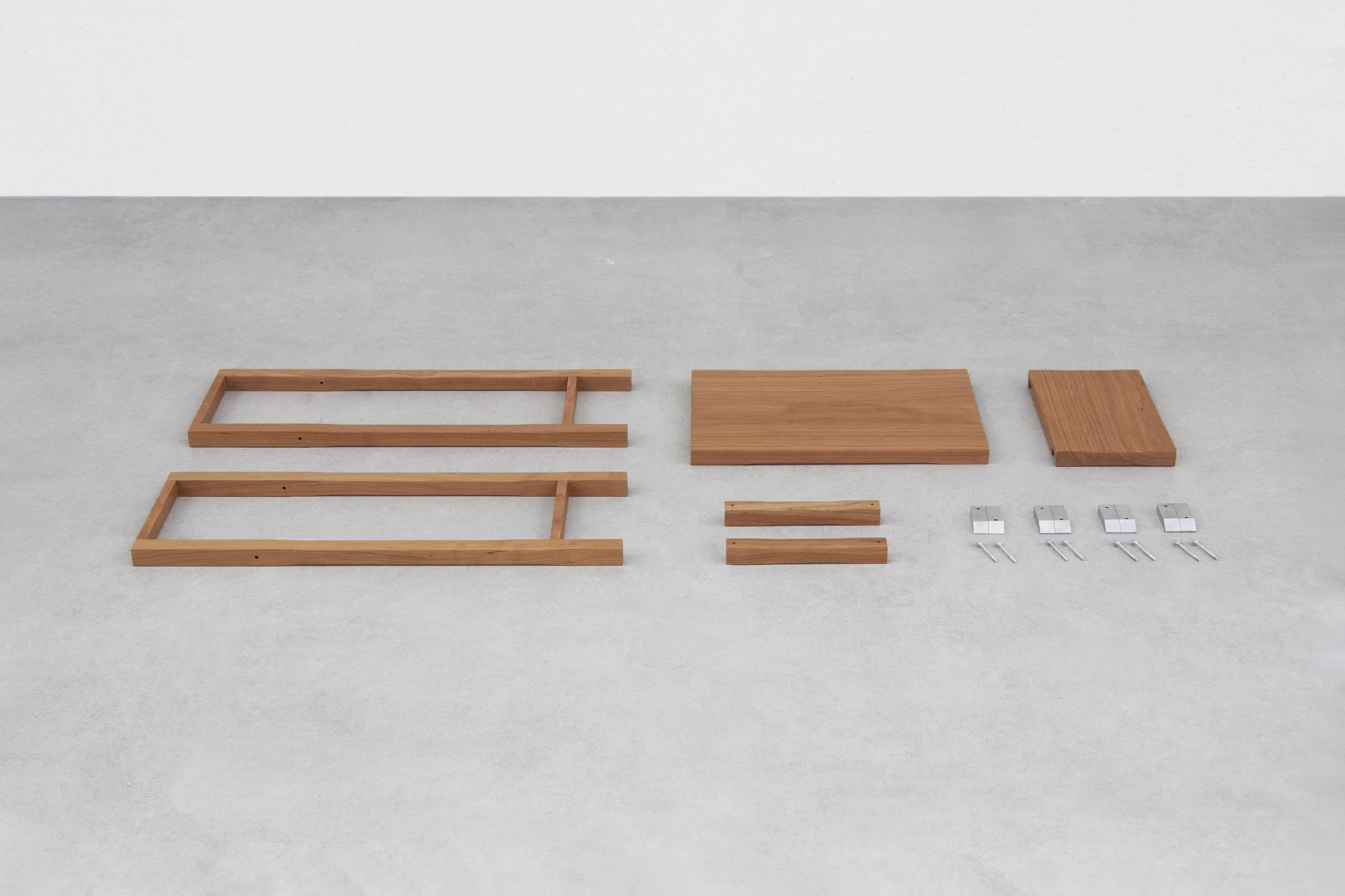 The outcome is Defocus: a furniture collection that offers a merging, or indeed clamping together, of these two paths of interest in Alonso’s work. Comprising a side table, clothes butler and floor lamp, each of the furniture pieces can be simply assembled and disassembled using a series of small aluminium clamps designed by Alonso and custom made by a Spanish CNC specialist. Unlike other flatpack furniture, Defocus’s assembly needs no extra tools given that the tool itself becomes a feature of the furniture, the clamps’ matt-silver bodies sitting as charming accents against the cherry wood they hold together.