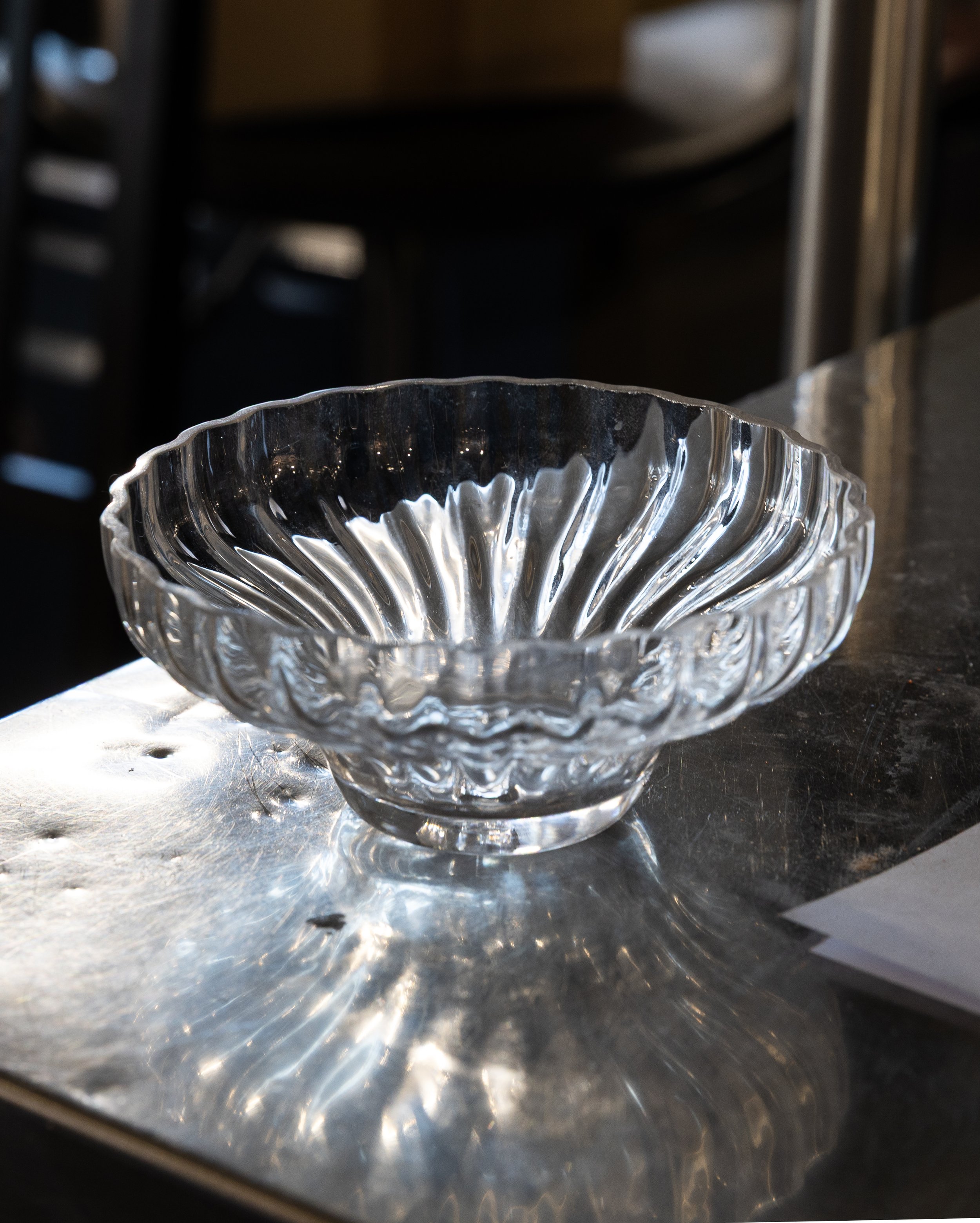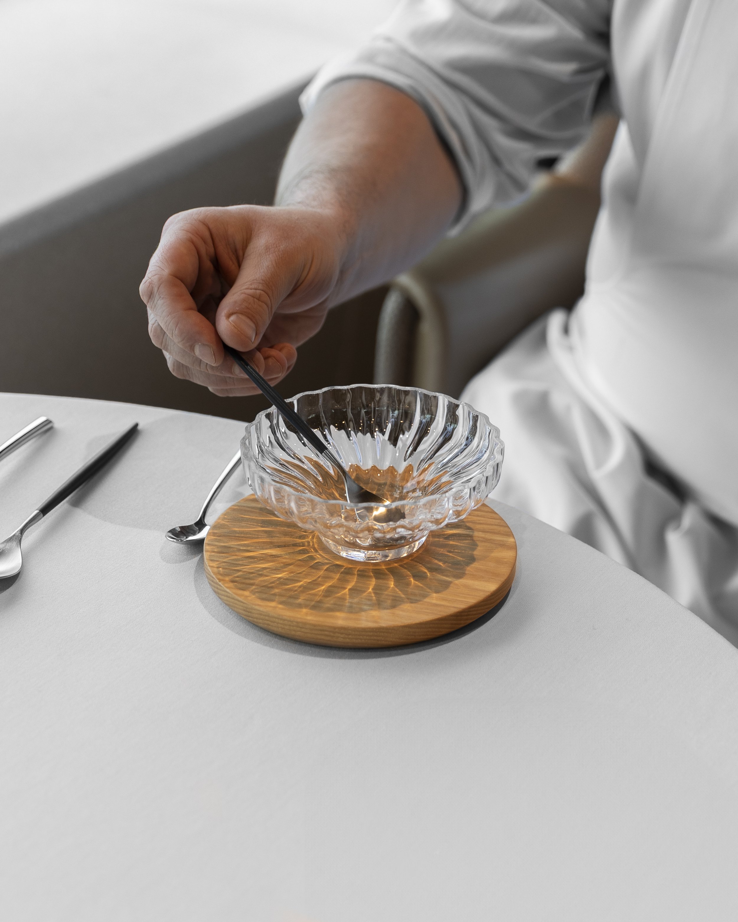While the form’s ripples are clear references to the Baltic, the angle at which they swim out from the bowl also conceals a nod to Revell and Petäjä’s original architecture. Although the bulk of the Palace building is boxy as befits its functionalist approach, the top floors feature gently angled roofs that soften the overall silhouette and which are apparent within the interior of the restaurant itself, framing the dining space. “If you look at the bowl from the side, it actually has that same angle, but in a more organic, inverted form.” This angle is also a detail that makes the most of the sunlight that streams into Palace’s interior from across the Baltic – “A very blue light reflecting from the ice and snow on the sea in the winter, but a very different quality of light in summer,” Lindberg summarises – with the shape of the clear glass splitting both this natural light and the restaurant’s built-in spotlights into ripples and veins of shade that flow across the wooden mats on which the bowls are presented.