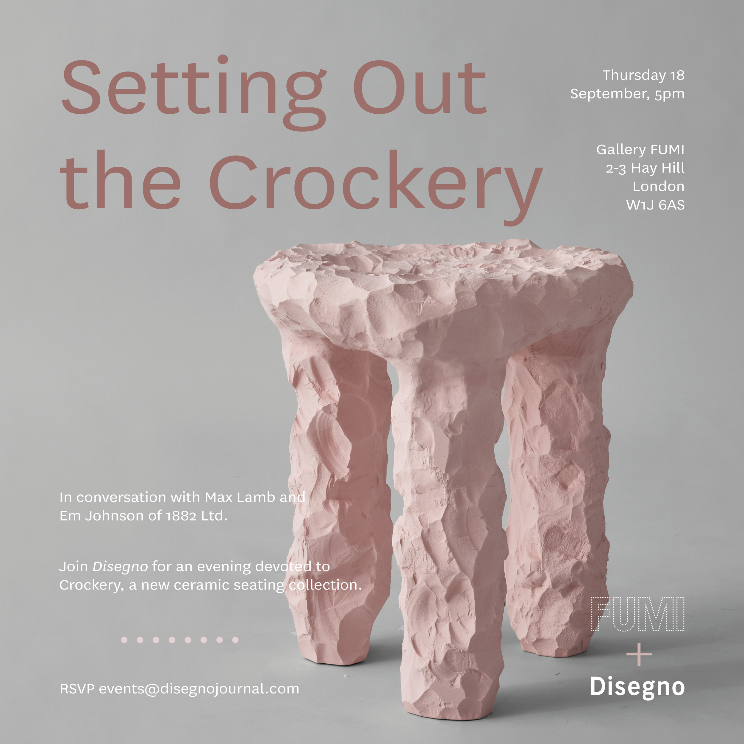 Join Disegno for an evening devoted to Crockery, a new ceramic seating collection developed for Gallery FUMI by Max Lamb and 1882 Ltd. The result of material experimentation, Crockery presents elemental chairs and stools that have been carved, slip-cast, fired and cooled, and which push clay to its material limits. Over the course of this evening, Lamb and Em Johnson, the director of master ceramicists 1882 Ltd., will share the story behind the collection.