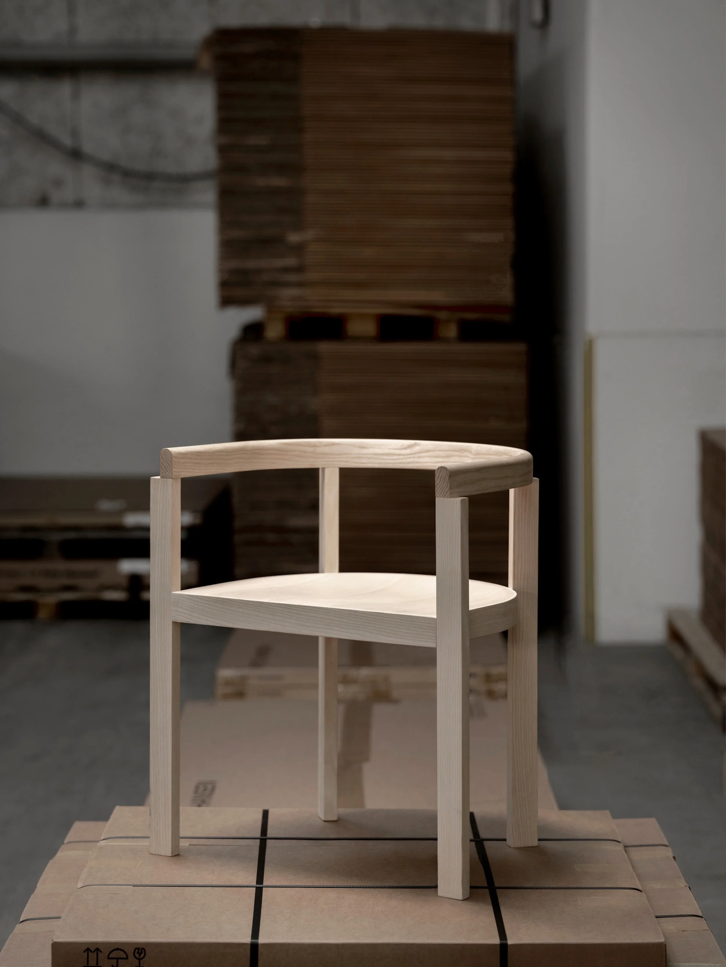 The After chair retains Kjærholm’s wraparound armrest design, which Anastassiades has rendered in ash wood rather than steel. “It’s very much a chair that you hold,” he says, stroking the armrests, which swoop backwards to hug the lower back. All of the chair’s legs are straight and squared, giving it a more geometric appearance than its bow-legged antecedents. While the chair’s curved backrest is the same thickness as its legs, the backrest is mounted vertically rather than horizontally, making it appear thinner and giving the impression that it is floating on top of the frame. “Wood is a natural material – it’s never stable, it’s alive,” Anastassiades says, explaining that the team had to slice the wood with fine blades and glue two pieces together in a crescent shape in order to create a curved backrest made from solid wood. “It was very difficult to achieve the precise alignment – the tolerances seemed impossible,” he adds. While Danish designers in the past might have used steam bending to create a similar effect, Anastassiades was able to take advantage of Fritz Hansen’s latest technology to execute every joint to the millimetre and thereby create a sturdier chair. “Even steam bent wood would still move afterwards,” he says. “This technique creates that stability by breaking the structure of the wood.”