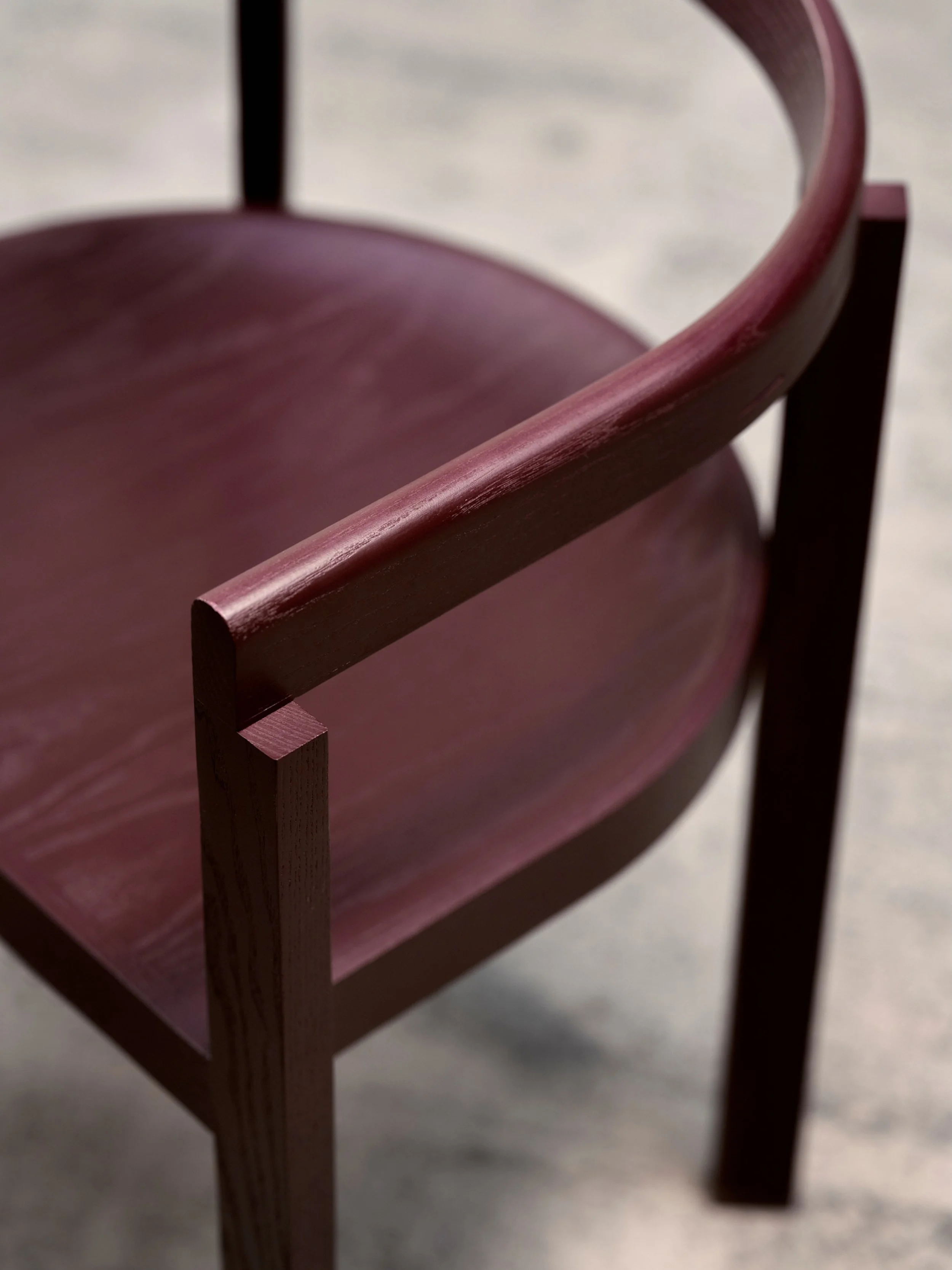 While Anastassiades always knew that he wanted to create a wooden chair, his choice of ash was determined by which species of tree was plentiful on the market and therefore could be sustainably sourced. “All wood is beautiful,” he says, explaining that he chose to finish the chair with a combination of wax and oil to make it look as natural as possible. “It’s a hard-wearing finish that feels like it has never been treated.” The chair is also available in a painted burgundy, which acts as a modern take on a traditional dark wood version of a chair. “By painting it, we were able to rescue the wood by covering up small imperfections that might distract a little bit visually,” he says. While the natural wood version is sanded smooth, the texture of the painted chair’s wood grain is retained. “Maintaining the grain gives you that natural feel,” he explains. The chair’s matching table uses a similar design language, with its circular tabletop hovering over thick rectangular legs, but the burgundy version features a marble tabletop that is more durable than painted wood.
