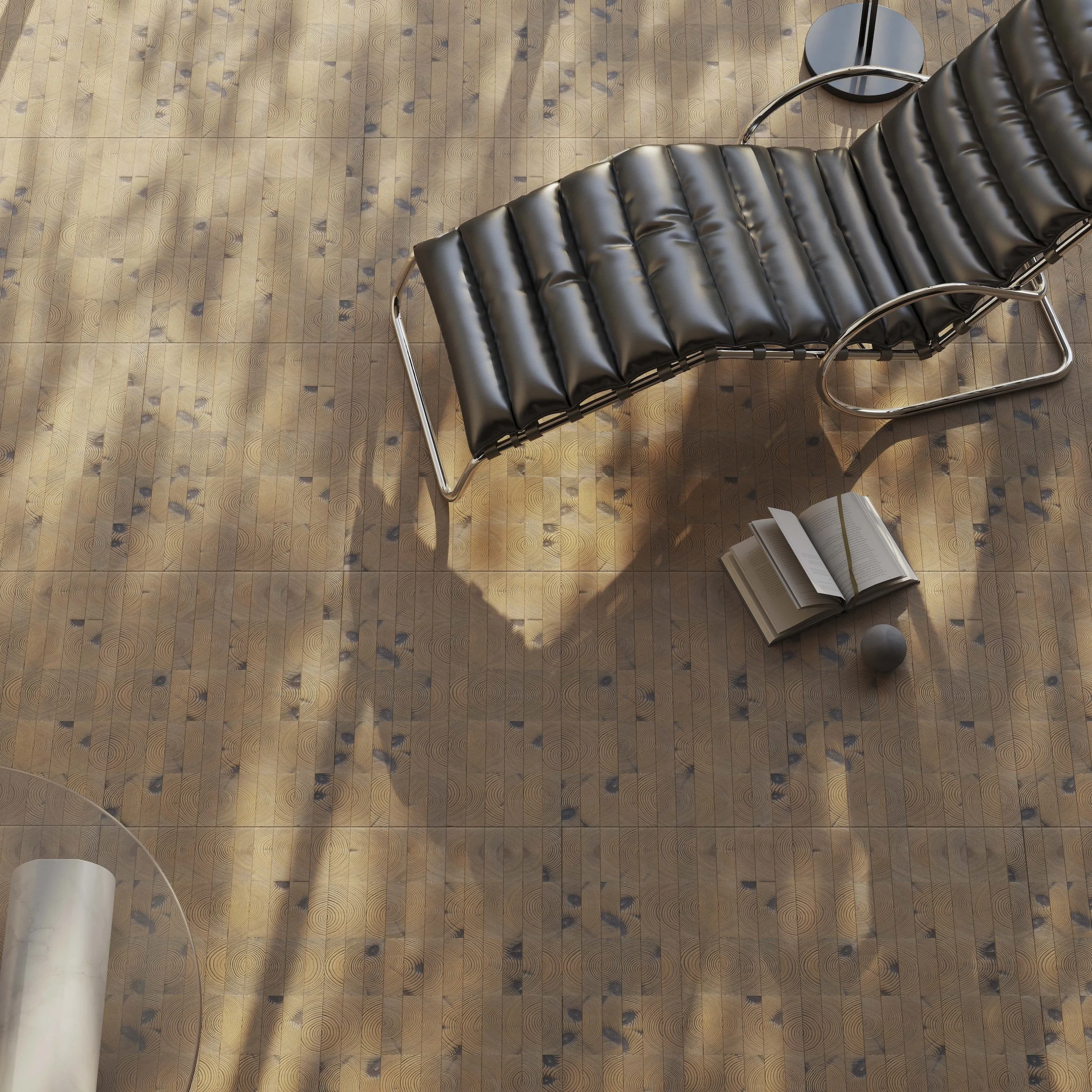 Trafic is made up of rectangular tiles of pine wood that ripple with tree rings. Wood knots are scattered across the parquet like stones that have just been skipped across a lake. As a softwood, pine is an unusual choice for Listone Giordano, which typically trades in more expensive and durable hardwoods. But by using end-grain wood, which is cut across the growth rings at a 90°-angle to the grain, Sadler’s design is able to emphasise both the character and the durability of pine. “The end grain has a very strong resistance, which is very close to metal,” Sadler says, explaining that the angle of the wood cut naturally resists scraping and general wear while also exposing the texture of its growth rings. The collection was inspired by 19th-century wooden pavements made with end-grain wood which were once popular across Europe, providing a quieter, cheaper and safer alternative to stone cobbles. “The beauty of this product is that it’s so random,”he says. “You even see the defects of the wood, where the branches used to grow and snapped off. It’s not always centred, not always perfect – it’s a rustic pavement.”