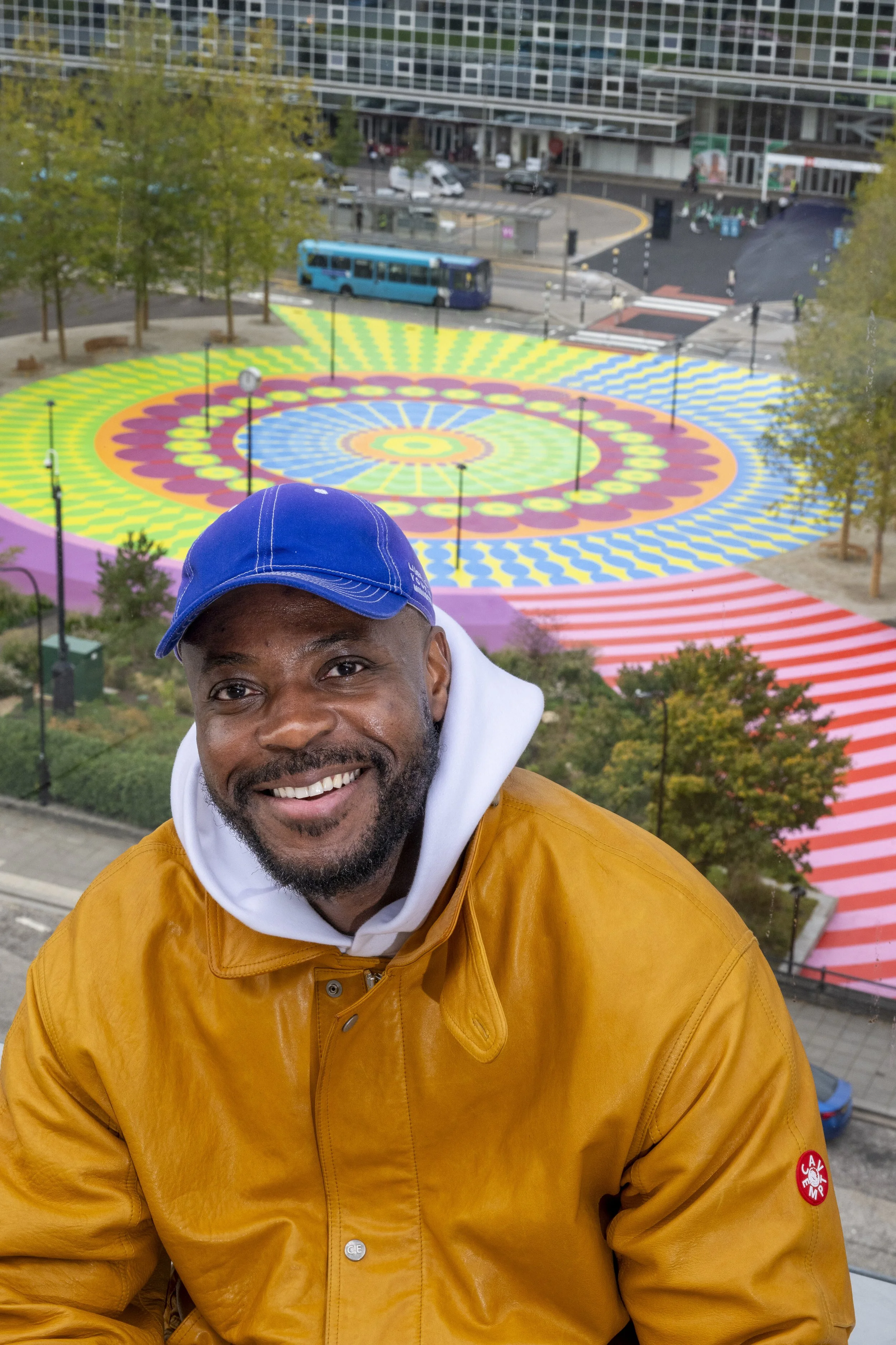 Yinka Ilori, photographed in his Walk With Your Dreams mural in Milton Keynes (photograph: Stephen Chung).