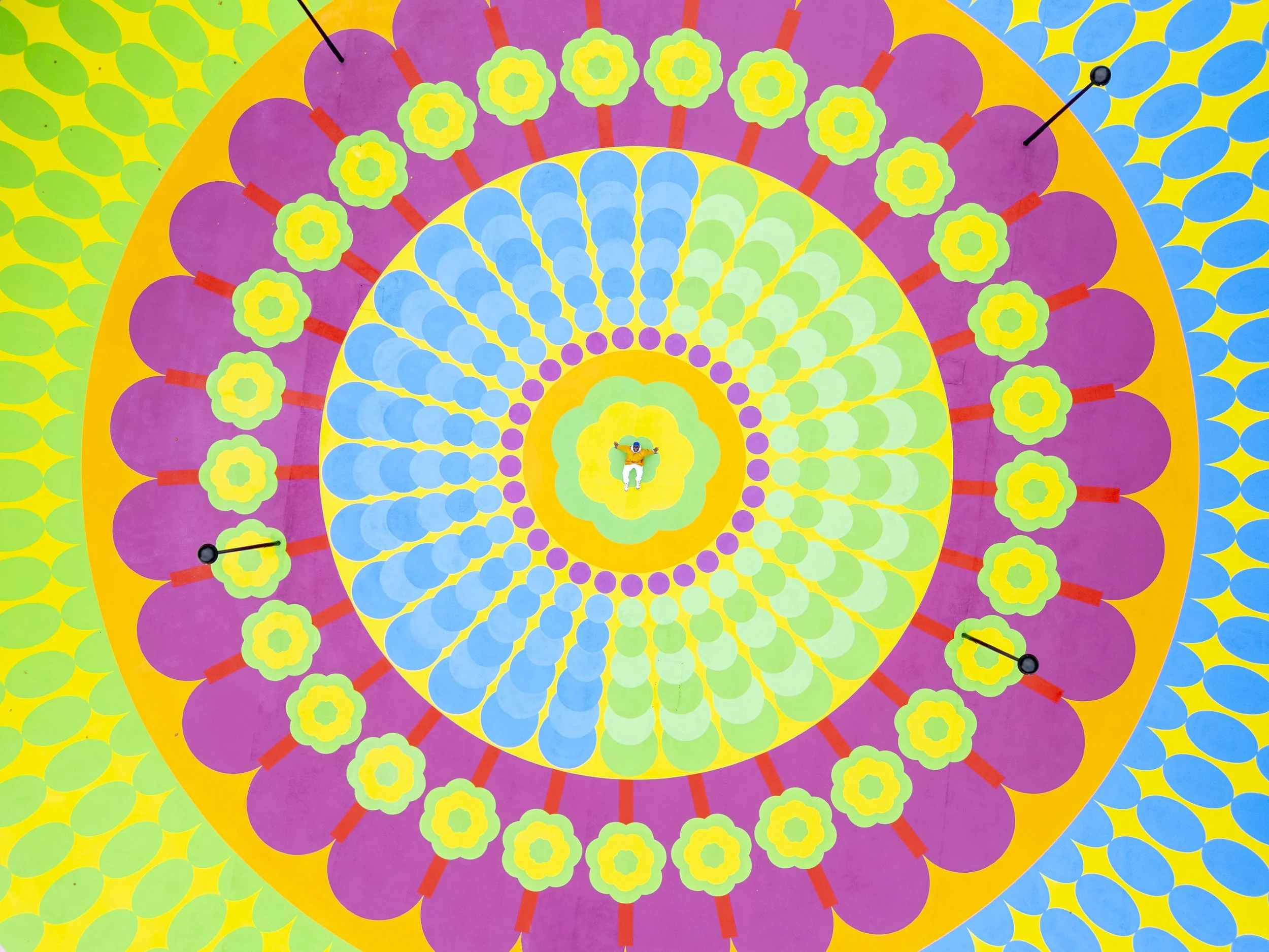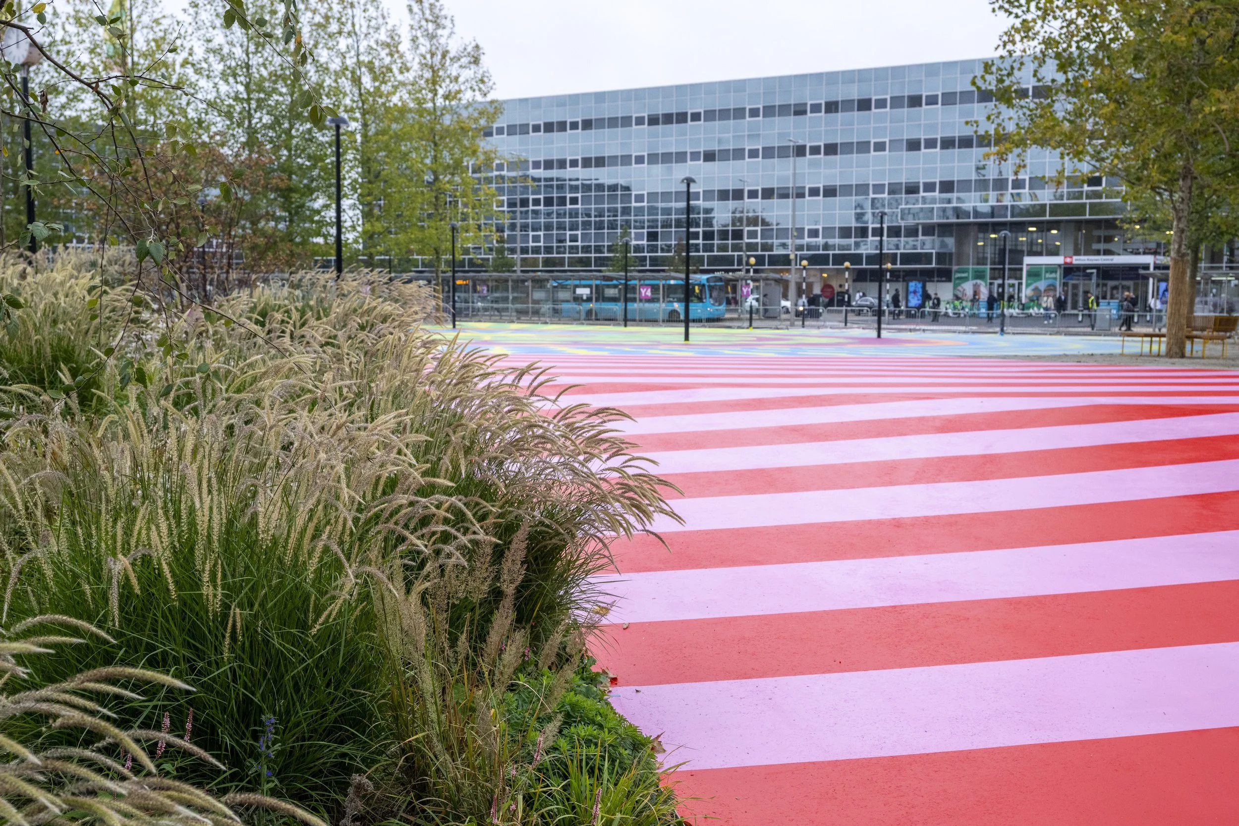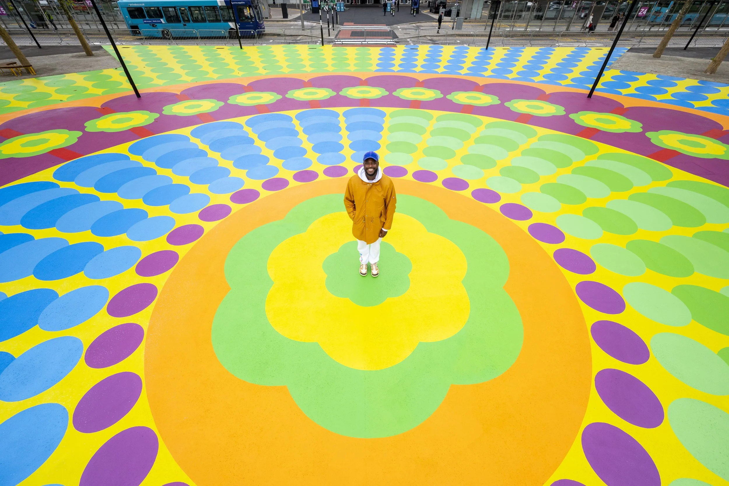 Faced with these issues, Ilori’s mural is intended to introduce a more fluid, vibrant entry point to the city’s grid, which Mahendran describes as “highlighting the vibrancy and the diversity and creativity in the city.” To capture this, Ilori’s artwork swirls in circles of lime, yellow, blue and pink, bordered with Prairie-grassland planting overseen by landscape architects Planit, who have also seeded the square with mature plane trees to introduce verticality to its broad horizontal vista. Radiating out from the circular centre of his mural, Ilori has painted tractor beams of candy pink stripes that draw visitors down into the twin underpasses that lead out onto the similarly plane-lined Midsummer Boulevard, Milton Keynes’ central artery. “There are different paces within the artwork,” Ilori says, “I want you to run down those [stripes], whereas when you’re in the middle of everything, that’s slower and circular. It’s a moment to reflect.”